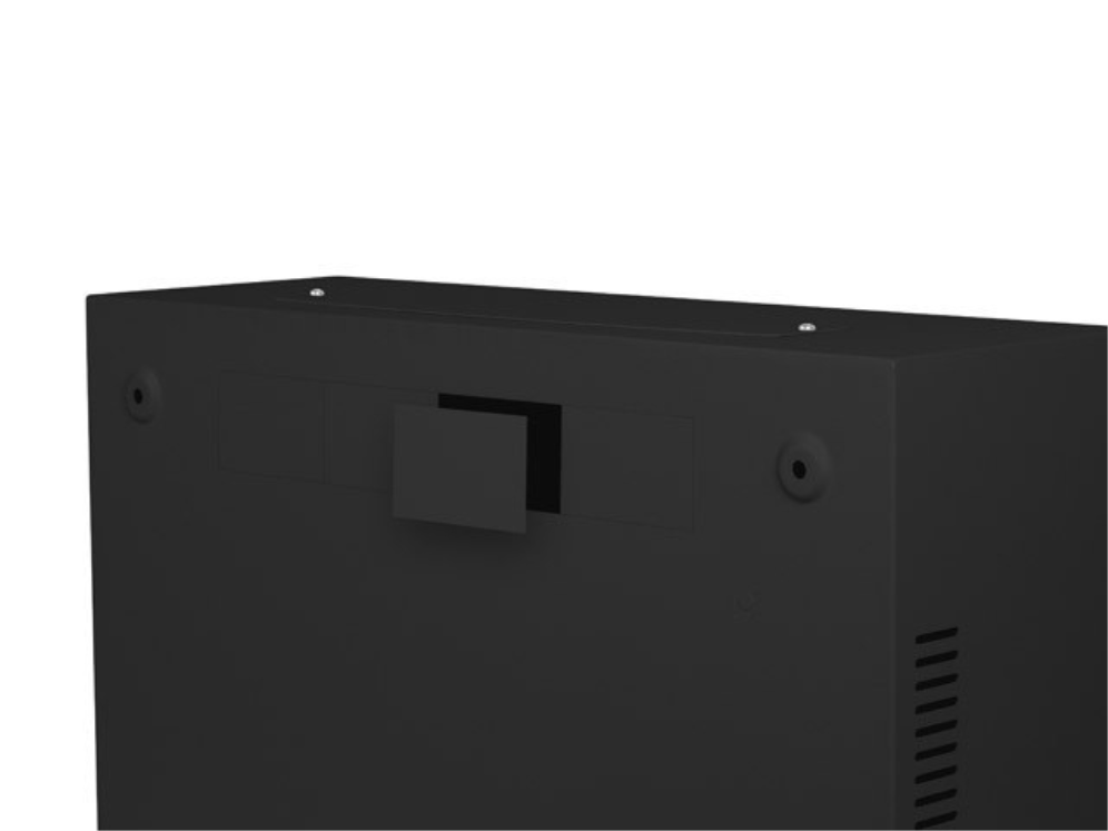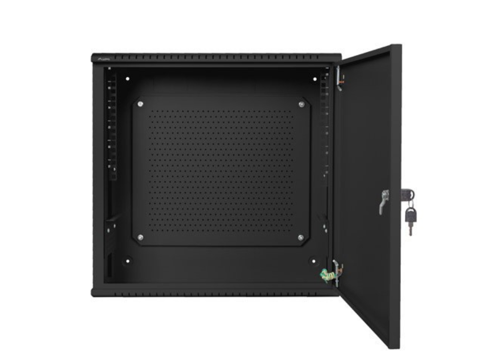 Diseñado en color negro, con puerta delantera metálica equipada con cerradura y ángulo de apertura de 220°. Cuenta con bloqueo de teclado para mayor seguridad y rieles de rack que facilitan la instalación de equipos. Protección IP20 contra el polvo en ambientes interiores.