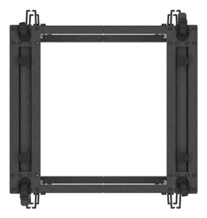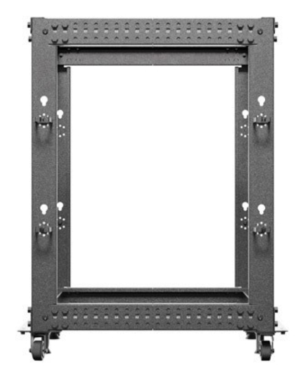 Color negro, con cuerpo frontal abierto y puerta trasera de apertura sencilla. Dispone de rieles de rack para facilitar la instalación del equipo. La estructura incluye ruedas para un desplazamiento cómodo y versátil.