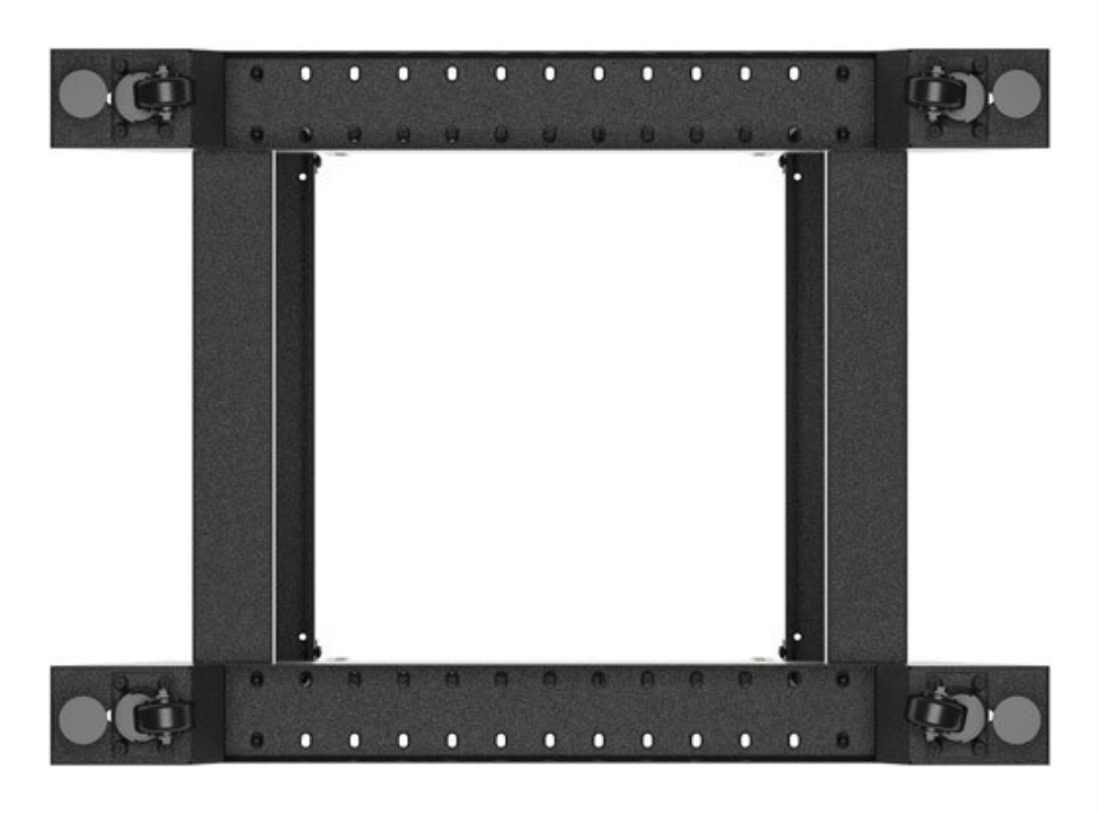 Acabado en color negro, con cuerpo frontal abierto y puerta trasera con apertura sencilla. Equipado con ruedas para facilitar su desplazamiento. Requiere instalación previa para su montaje completo.