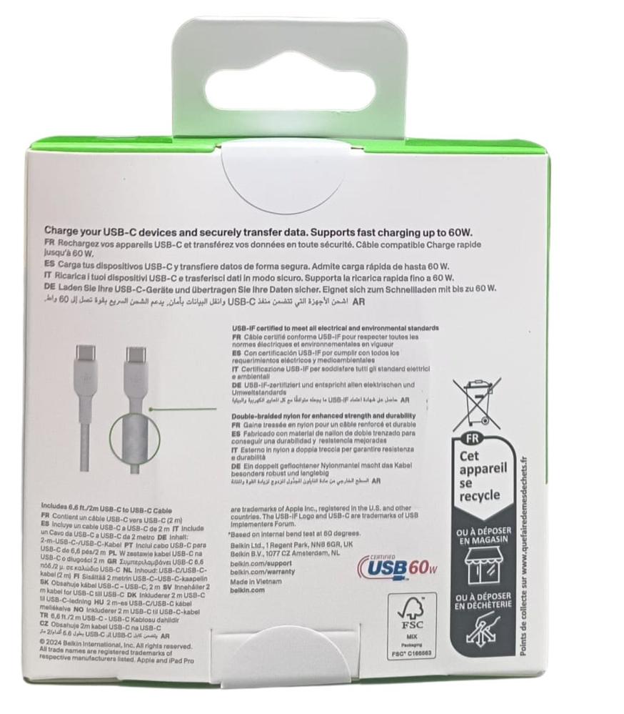 Cable usb tipo c belkin 2m – macho – macho – blanco – trenzado