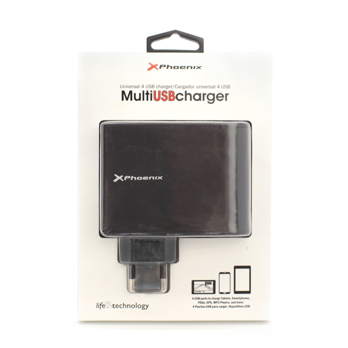 Este cargador diseñado por Phoenix Technologies cuenta con cuatro puertos USB de carga simultánea especialmente diseñados para cargar todo tipo de Smartphones, tabletas, altavoces y todo tipo de dispositivos USB a la vez.