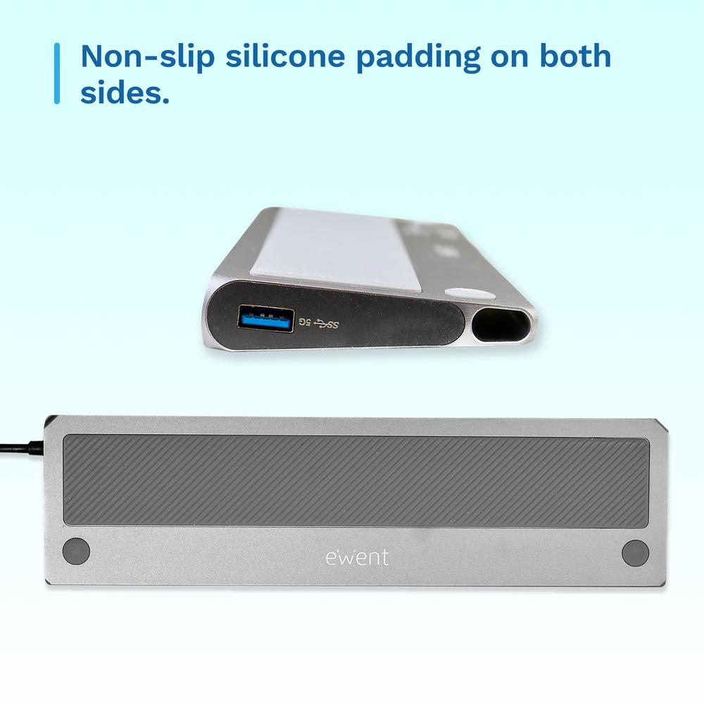 Su acolchado de silicona antideslizante en ambas caras asegura una fijación estable sobre cualquier superficie, evitando deslizamientos y protegiendo tanto al docking como al portátil.