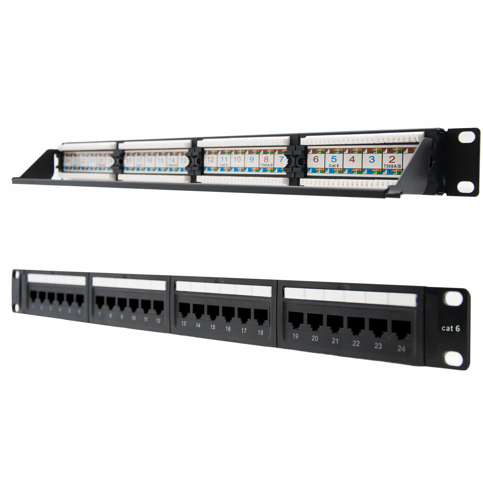 1 x Panel de parcheo de 24 puertos rj45 cat.6 utp, 19″ 1u dual idc, negro