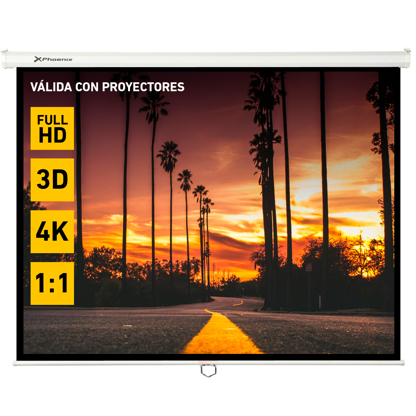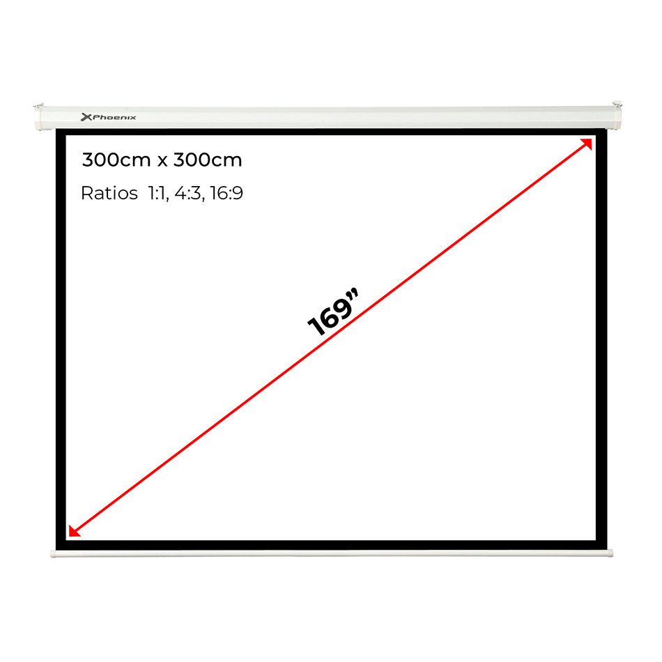 Pantalla manual videoproyector pared y techo phoenix 169´´ ratio: 1:1 – 4:3 – 16:9 – 3m x 3m posicion ajustable – carcasa blanca – tela super resistente