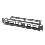 Panel en blanco de 1U para montaje en racks de 10″, fabricado en metal con acabado negro RAL9004. Dispone de 12 puertos vacíos para instalación de módulos keystone de red, audio, vídeo o datos. Incluye identificación de puertos mediante campos numerados.