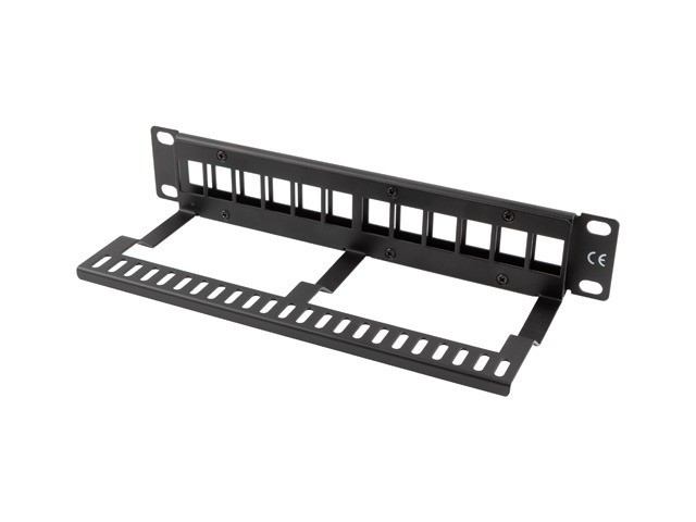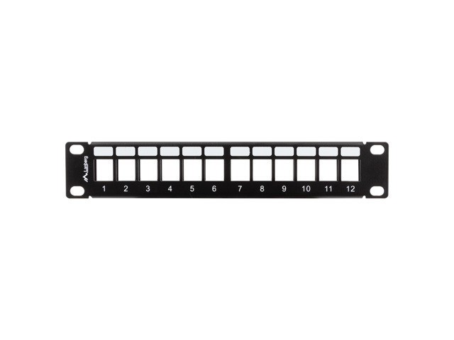 Panel en blanco de 1U para montaje en racks de 10″, fabricado en metal con acabado negro RAL9004. Dispone de 12 puertos vacíos para instalación de módulos keystone de red, audio, vídeo o datos. Incluye identificación de puertos mediante campos numerados.