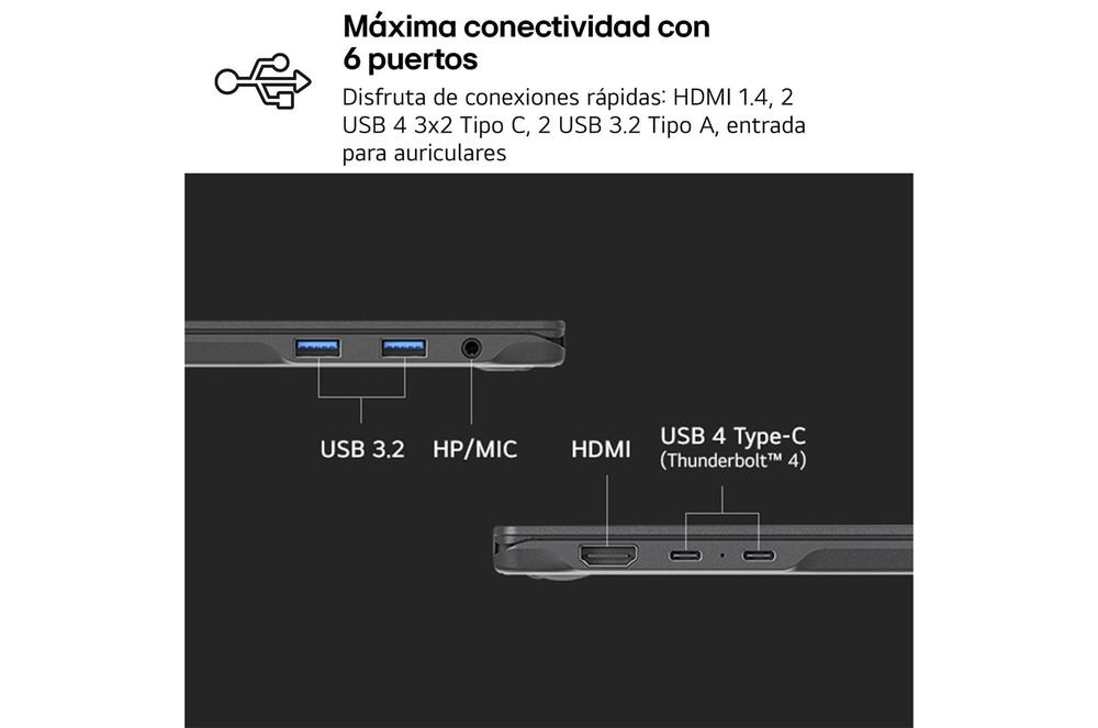 El LG Gram 14 incorpora WiFi 6E y Bluetooth 5.1 para conexiones inalámbricas ultrarrápidas. Dispone además de una amplia selección de puertos modernos, como USB-C con Thunderbolt™ 4, HDMI 2.1 y USB 3.2 Tipo A, permitiendo la conexión de periféricos, pantallas externas y carga rápida.