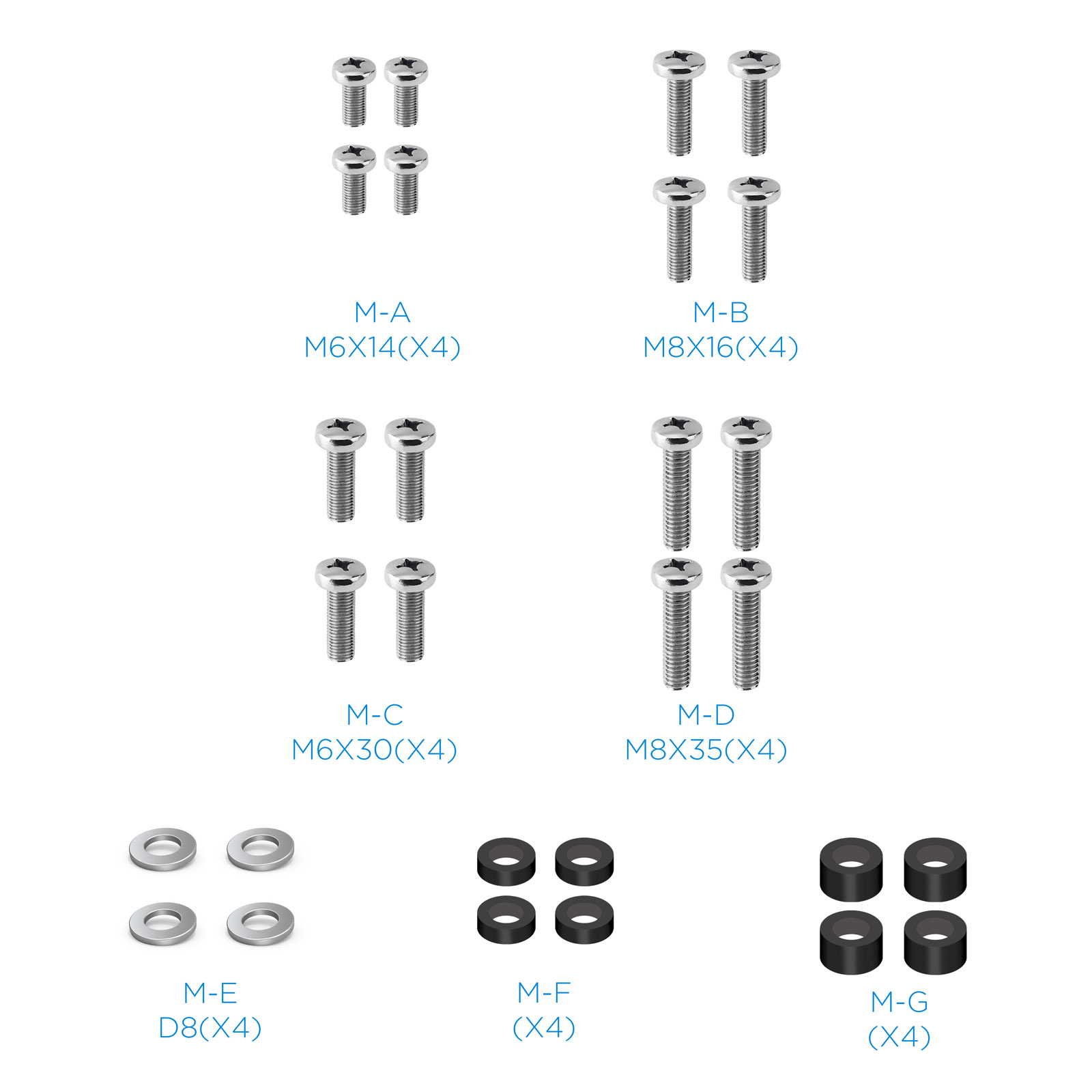 Compatible con VESA: 100×100, 150×100, 100×150, 100×200, 200×100, 150×150, 200×200, 300×200, 400×200, 300×300, 400×300, 600×200, 400×400, 600×300, 600×400