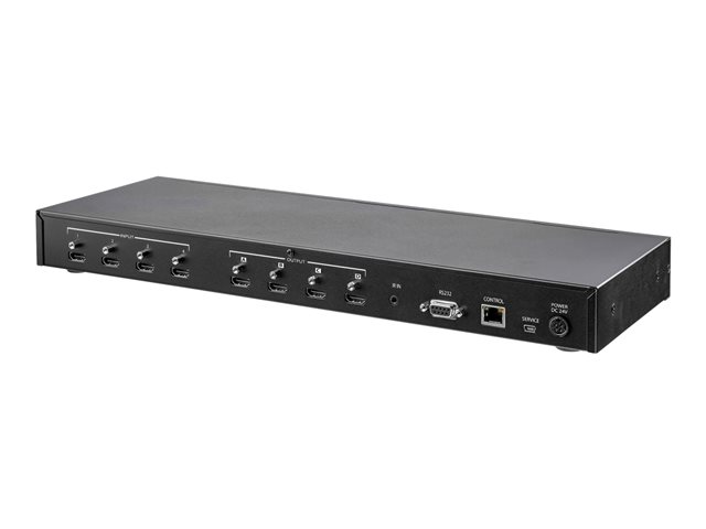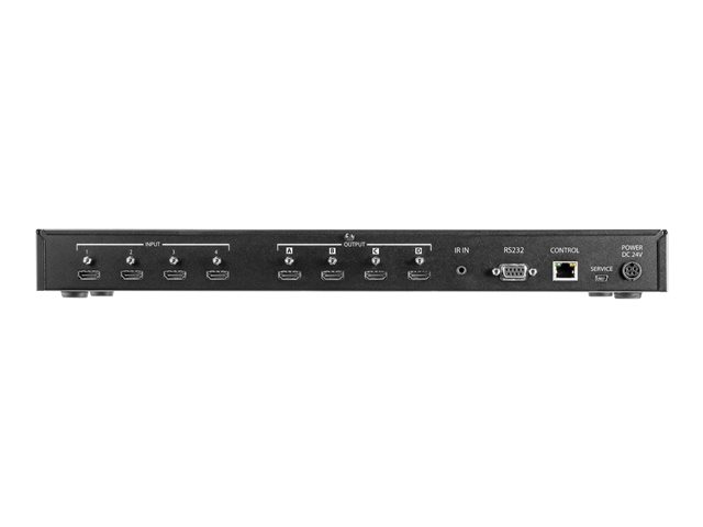Gracias a sus **4 puertos de entrada y 4 de salida HDMI**, este conmutador ofrece una distribución flexible de contenido desde varias fuentes hacia varias pantallas. Además, incluye un puerto serie **RS-232 DB-9** para integrarse con sistemas de control y automatización profesionales.